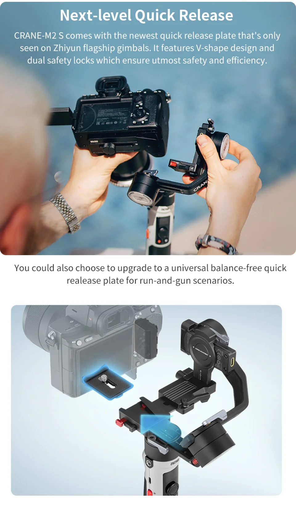 CRANE-M2 S comes with the newst quick release plate that’s only seen on ZHIYUN flagship gimbals. It features V-shape design and dual safety locks which ensure utmost safety and efficiency.