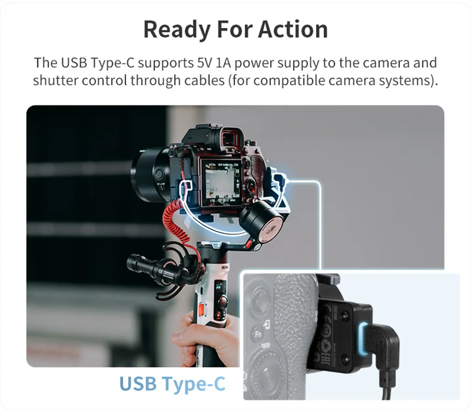 The USD Type-C supports 5V 1A power supply to the camera and shutter control through cables.