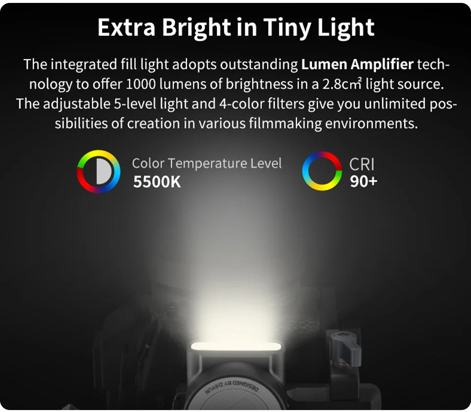 The integrated fill light adopts outstanding Lumen Amplifiers technologt to offer 1000 lumens of brightness in a 2.8cm² light source. The adjustable 5-level light and 4-color filters give you unlimited possibilities of creation in various filmmaking environments.
