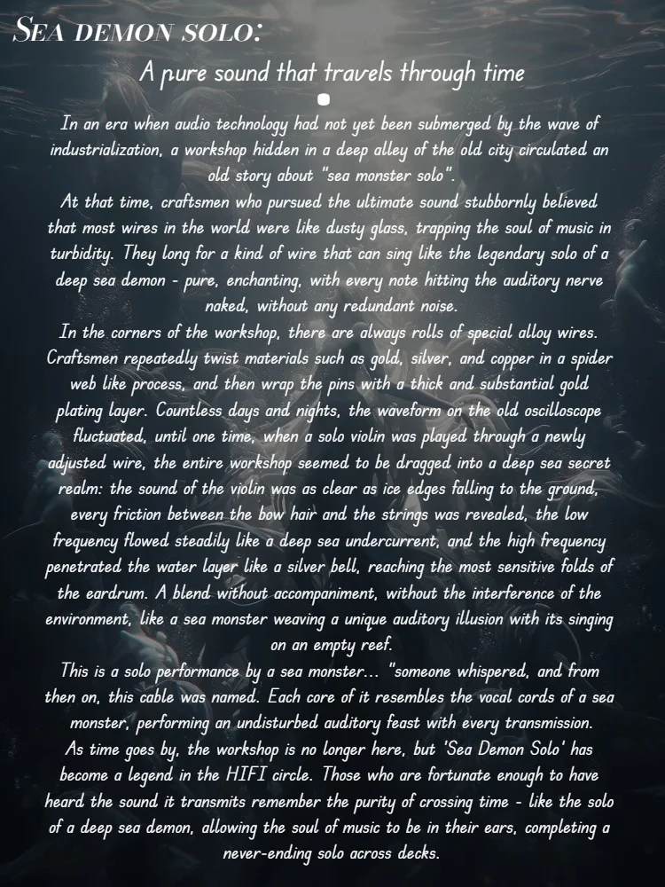 Product Description1. Product Name: Sea demon solo2. Product Code: ZiSin-3063. Brand: ZiSin4. Model: 8-core5. Resistance: 0.16 Ω6. Conductor: palladium plated oil immersed graphene+high conductivity 7Nocc silver plated palladium+graphene gold plated7. Cable structure: Balanced type8. Sheath material: Medical grade PVC9. Length: 1.23 meters ± 3 centimeters10. Plug type: 2.5mm/3.5mm/4.4mm11. Connector: MMCX/0.78mm 2-pin/IE900/groove -0.78 2-pin12. Plug material: 3604 brass+ABS transparent rubber13. Accessory material: 6063 national standard aluminum, 72 hour salt spray test一.Voice expression and characteristicsHigh frequency: ultimate extension and air feelThe palladium coated oil immersed graphene layer significantly reduces the skin effect through nanoscale structural optimization, making high-frequency signal transmission more efficient, exhibiting natural extension at extremely high frequencies and extremely high detail density.The oil immersion process further improves the dielectric performance, reduces signal distortion, and provides a transparent and delicate high-frequency sound without being harsh. Compared to traditional silver plated wires, it appears more warm and moist.Mid frequency: Rich and full-bodied with emotional expressionThe silver based conductor of 7N OCC silver plated palladium provides the unique transparency of silver wire, while the addition of palladium element effectively neutralizes the cold and hard feeling of silver, making mid frequency human voice more dense and fleshy, such as the throat resonance of female voice and the magnetic characteristics of male voice can be presented delicately.The synergistic effect of graphene enhances signal response speed, and the intermediate frequency transient performance is sharp and not sluggish, suitable for performing drum beats and guitar sweeping in pop music.Low frequency: control force and diving depthThe 7N OCC single crystal copper core provides the unique low-frequency solidity of copper wire, while the composite structure of silver plated palladium and graphene on the outer layer enhances the speed and elasticity of low frequencies, resulting in deep diving and flexible retraction.The oil immersion process reduces low-frequency standing waves by filling the gaps between conductors, resulting in a clean and reverberation free listening experience. Compared to ordinary copper wire, it appears more compact.、 Core advantagesMaterial innovation and synergistic effectsThe disruptive effect of graphene: Its single atomic layer structure greatly improves signal transmission efficiency, while enhancing the tensile and oxidation resistance of the wire, and its lifespan far exceeds that of traditional silver plated wire.The tuning value of palladium: As a rare and precious metal, palladium has unique advantages in low-frequency control and mid frequency density, complementing silver and gold to avoid the sound defects of a single metal.Black technology of oil immersion process: Through 72 hours of vacuum immersion, the dielectric constant of the conductor is reduced by more than 30%, and the background noise approaches zero, achieving detailed analysis under a "dark background".Anti interference and stabilityThe multi-layer composite structure effectively isolates electromagnetic interference, especially suitable for high-sensitivity IEMs and open headphones, with outstanding bottom noise suppression ability.The plugs and pins coated with graphene gold achieve atomic level bonding through chemical plating technology, reducing contact resistance to below 0.05 Ω and making them less prone to oxidation during long-term use.Adaptability and compatibilityThe overall impedance of the wire is controlled at 0.16 Ω, suitable for all scenario devices from mobile phones to desktop computers, with low driving threshold and stable dynamic performance.The mixed conductor design is more versatile in terms of tone orientation, which can enhance the mid frequency thickness of the cold sound headphones and soften the high-frequency burrs of the warm sound system.、 Sound Field and Spatial PerceptionHorizontal width and separation degreeThe high conductivity of graphene and the dielectric optimization of oil immersion process result in a transverse widening of the sound field by about 15% -20%, making instrument positioning more accurate and the sense of hierarchy clear and distinguishable.The high-frequency extension of the silver plated palladium layer further enhances the air feel of the space, especially in live recording, which can restore the environmental atmosphere of the audience seat.Longitudinal depth and imaging forceThe low-frequency solidity of the 7N OCC single crystal copper core provides a stable "foundation" for the sound field, while the transient response at medium and high frequencies gives the instrument a three-dimensional sense of structure.The contact points coated with graphene gold enhance signal integrity, making the depth of the sound field closer to the "real stage", and providing a natural and comfortable distance between vocals and accompaniment.、 Process characteristics and manufacturing difficultiesMaterial Processing and Composite TechnologyGraphene electroplating process: Ultrasonic assisted electroplating is used to ensure that graphene uniformly covers the surface of the conductor, with a thickness controlled at 1-5 microns to avoid affecting the flexibility of the wire.Oil immersed vacuum treatment: Vacuum impregnation is carried out in a liquid nitrogen environment at -196 ℃, allowing the oil to penetrate into the lattice gaps inside the conductor. The process complexity far exceeds that of ordinary wire rods.Litz structure weaving: The 7N OCC silver plated palladium wire core adopts Type 6 Litz weaving with over 300 strands, effectively reducing skin effect and phase distortion.Quality Control and TestingEach batch of wire requires a 72 hour salt spray test, 1000 bending tests, and full